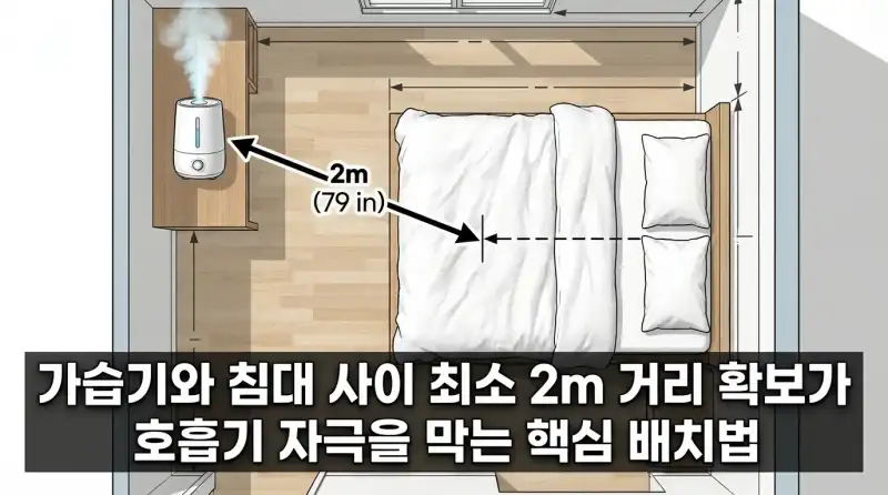 가습기를 머리맡 바로 옆에 두고 자면 안 됩니다. 헬스조선(2025.12) 보도에 따르면, 가습기의 이상적 위치는 바닥에서 최소 1m 이상 높은 곳, 사람으로부터 최소 2m 이상 거리를 둔 곳이에요. 차갑고 굵은 수분 입자가 호흡기로 직접 들어가면 기관지 점막을 자극해 기침이나 비염 증상을 악화시킬 수 있습니다. 톱클래스 매체에서도 “몸과 가습기의 거리는 최소 2~3m 떨어져 있어야 한다”고 강조합니다.