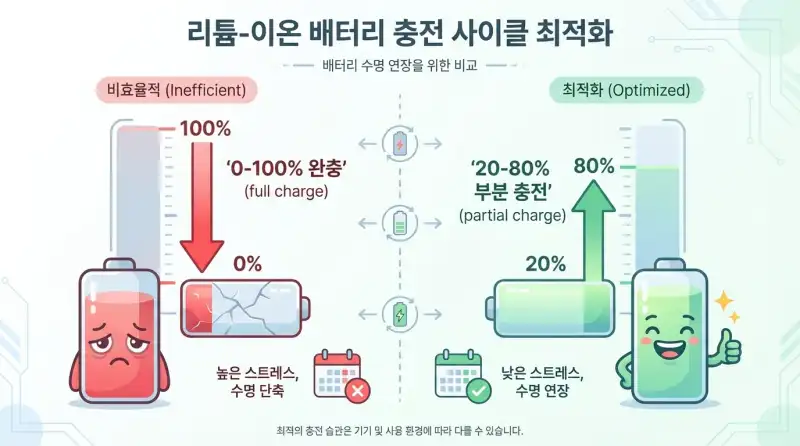 근데 여기서 핵심이 있어요. 같은 사이클 수라도 어떤 충전 범위에서 사용했느냐에 따라 배터리 수명이 완전히 달라집니다. 0%에서 100%까지 풀 사이클로 쓰면 약 430사이클 후 용량이 80% 이하로 떨어지지만, 20~80% 범위에서 사용하면 1,000사이클 이상 버틸 수 있다는 연구 결과가 있거든요.