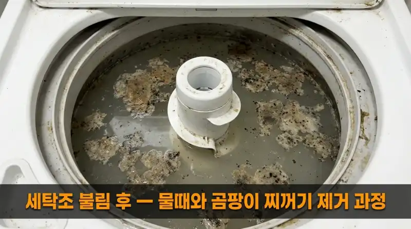 불림이 끝나면 떠 있는 찌꺼기를 망이나 국자로 건져내고, 표준 세탁 코스를 한 번 돌린 뒤 헹굼까지 마무리하세요. 거름망도 빼서 따로 솔로 문질러 세척해주면 완벽합니다.