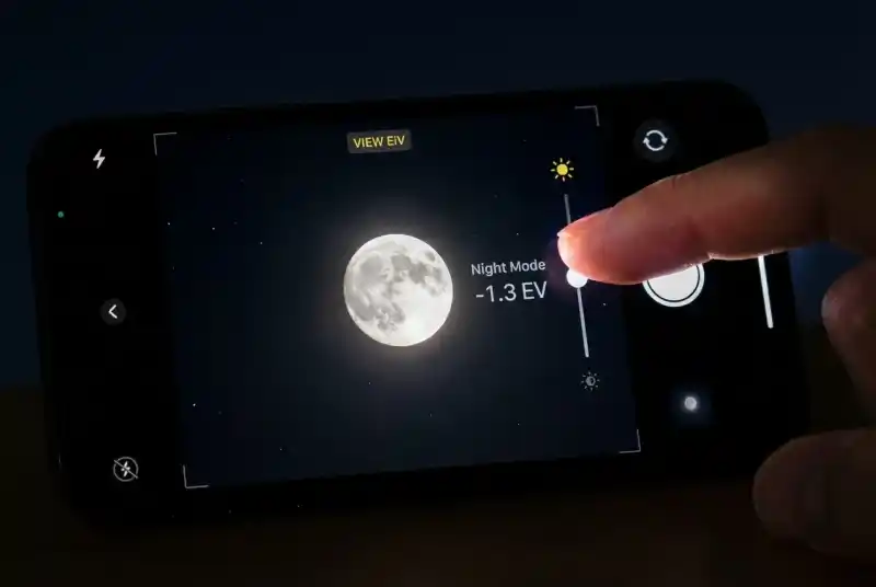 노출 조절이 가장 중요해요. 카메라 앱을 열고 달을 화면 중앙에 놓은 후, 화면을 길게 터치하면 AE/AF 잠금이 활성화되고 노출 슬라이더가 나타나요. 이 슬라이더를 아래로 당겨 노출을 낮추면 달의 과다 밝기가 줄어들고 크레이터와 표면 디테일이 선명하게 드러나요.