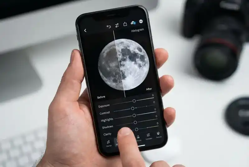 라이트룸 모바일 앱이 가장 추천돼요. 무료 버전만으로도 충분히 전문적인 보정이 가능해요. 먼저 노출과 하이라이트를 조정해서 달의 밝은 부분이 날아가지 않도록 하고, 그림자를 약간 올려서 크레이터의 디테일을 살려주세요.