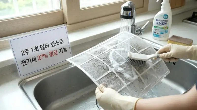 이건 진짜 사소한 것 같은데 효과가 어마어마해요. 환경부 자료에 의하면, 에어컨 필터의 먼지와 오염물질을 제거하는 것만으로 냉방 효과가 60% 이상 향상되고, 전기세를 27%까지 절감할 수 있다고 합니다. 한국에너지공단 데이터에서도 필터 청소를 월 1~2회 하는 경우와 안 하는 경우의 월간 전력소비 차이가 10.7kWh라고 나와 있어요.