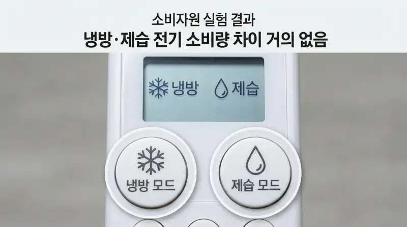 이게 제가 가장 많이 속았던 부분이에요. 인터넷에 “제습 모드로 돌리면 냉방보다 전기세가 적게 나온다”는 글이 정말 많거든요. 근데 한국소비자원에서 직접 실험한 결과, 제습 모드와 냉방 모드의 전기 소비량 차이는 거의 없었어요. YTN 보도에서도 이 실험 결과를 확인할 수 있습니다.