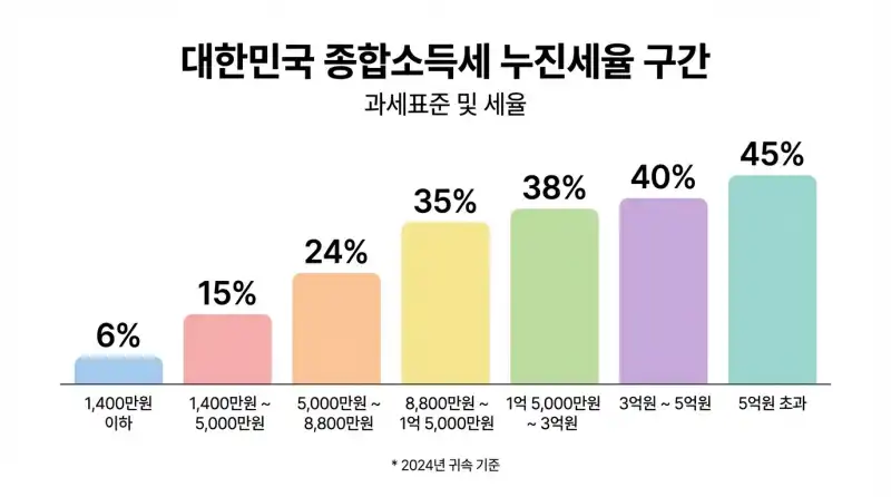 위 표는 2023~2024년 귀속 기준이에요. 3억 초과~5억 원 이하는 40%, 5억~10억 원은 42%, 10억 원 초과는 45%가 적용되고요. 2023년 귀속분부터 6% 구간이 기존 1,200만 원에서 1,400만 원으로, 15% 구간 상한이 4,600만 원에서 5,000만 원으로 올라갔거든요. 이 변경 덕분에 저소득 구간에서는 세 부담이 조금 줄었어요.