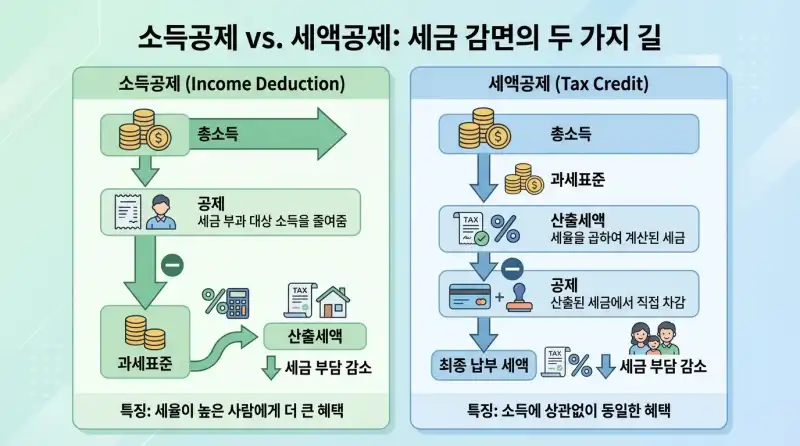 절세라고 하면 뭔가 복잡한 기술 같지만, 초보자 입장에서 당장 챙길 수 있는 건 몇 가지로 압축돼요. 소득공제와 세액공제, 이 두 가지 개념만 확실히 구분해도 세금이 달라져요. 소득공제는 과세표준 자체를 낮춰주는 거고, 세액공제는 이미 계산된 세금에서 직접 빼주는 거거든요.