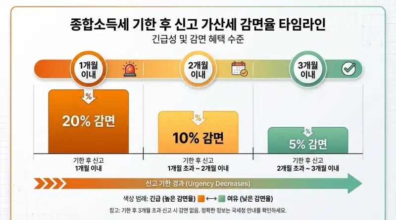 그런데 기한을 놓쳤다고 끝난 건 아니에요. “기한 후 신고”라는 게 있어서, 세무서에서 결정 통지를 하기 전까지는 자진 신고가 가능해요. 게다가 빨리 할수록 가산세 감면 혜택도 있어요. 신고 기한 후 1개월 이내에 하면 무신고 가산세의 50%를 감면받을 수 있고, 1~3개월 이내면 30%, 3~6개월 이내면 20% 감면이 적용돼요.